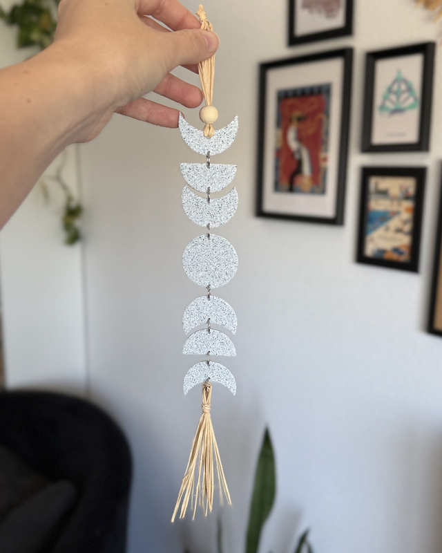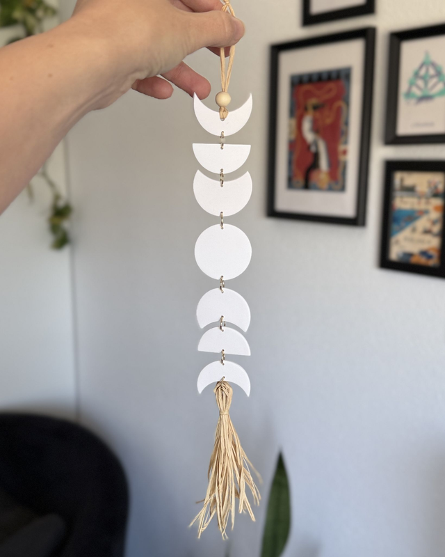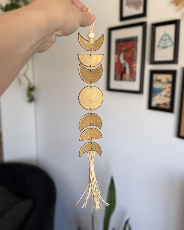 Los colgantes de fases lunares de AnaAtelier son ideales para decorar tu pared favorita y llenar tus espacios de buenas vibraciones. Cada pieza artesanal está hecha a mano con arcilla polimérica y rafia, creando un diseño ligero y duradero que representa cada fase de la luna de una manera especial y única.