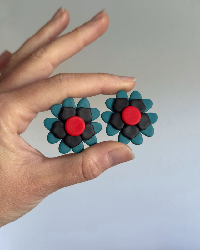 Los Groovy mini en tonos teal, rojo y negro, inspirados en el color tendencia Transformative Teal 2026. Diseño retro inspirado en los años 70, con fuerza, elegancia y personalidad, hechos a mano para mujeres que no quieren pasar desapercibidas 💥