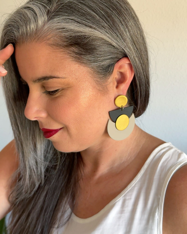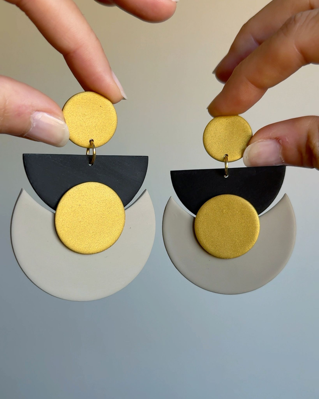 La luna 🌙 como inspiración, las formas geométricas que caracterizan a AnaAtelier y las combinaciones de colores que tanto os gustan, dan paso a unos pendientes con estilo y magnetismo únicos. Éstos en concreto, en color greige, negro y dorado, son de los más elegantes.