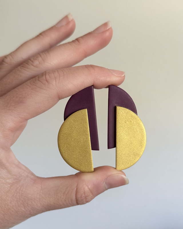 Estos pendientes, hechos a mano en arcilla polimérica, presentan una composición de semicírculos que añade un toque moderno y minimalista a cualquier look. Su diseño juega con la forma y el equilibrio, creando un accesorio versátil y sofisticado para cualquier ocasión.